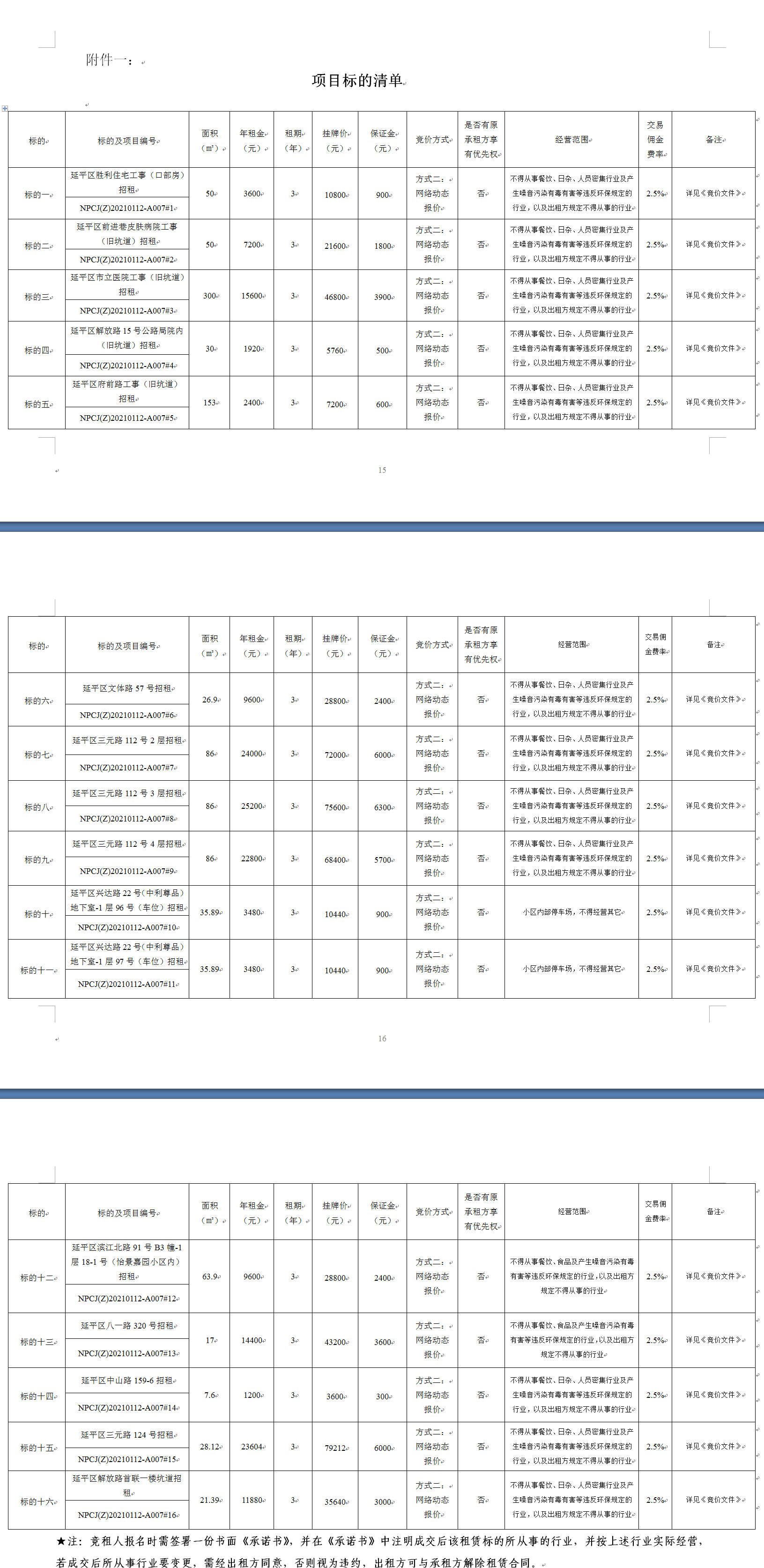 重要信息披露 | 1.租賃用途:詳見附件一。 2.為便于競買人計算面積單價,網(wǎng)絡競價以年租金底價進行報價,最終成交價以年租金的最高報價×租賃期限。 3.裝修情況:一般裝修,以實際現(xiàn)場看樣為準。 4. 租賃標的一至標的六、標的十三至標的十四及標的十六尚未辦理房屋所有權(quán)證和土地使用權(quán)證。 5. 具體事項以與出租方簽訂《南平市人民防空工程租賃使用合同》為準 | | |||||||||||||||||